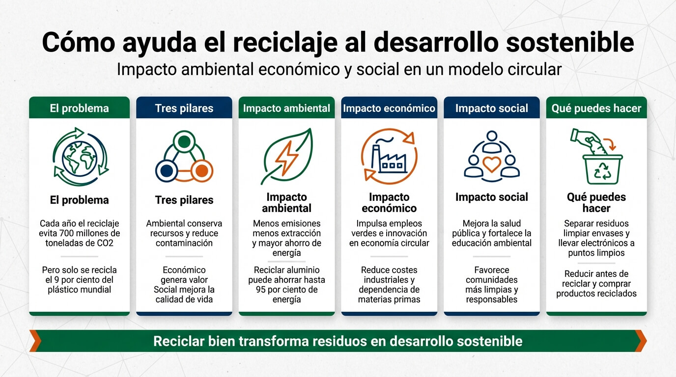 El reciclaje no es un acto simbólico ni una moda verde. Es una herramienta técnica, económica y social con impacto demostrable sobre los tres pilares del desarrollo sostenible.