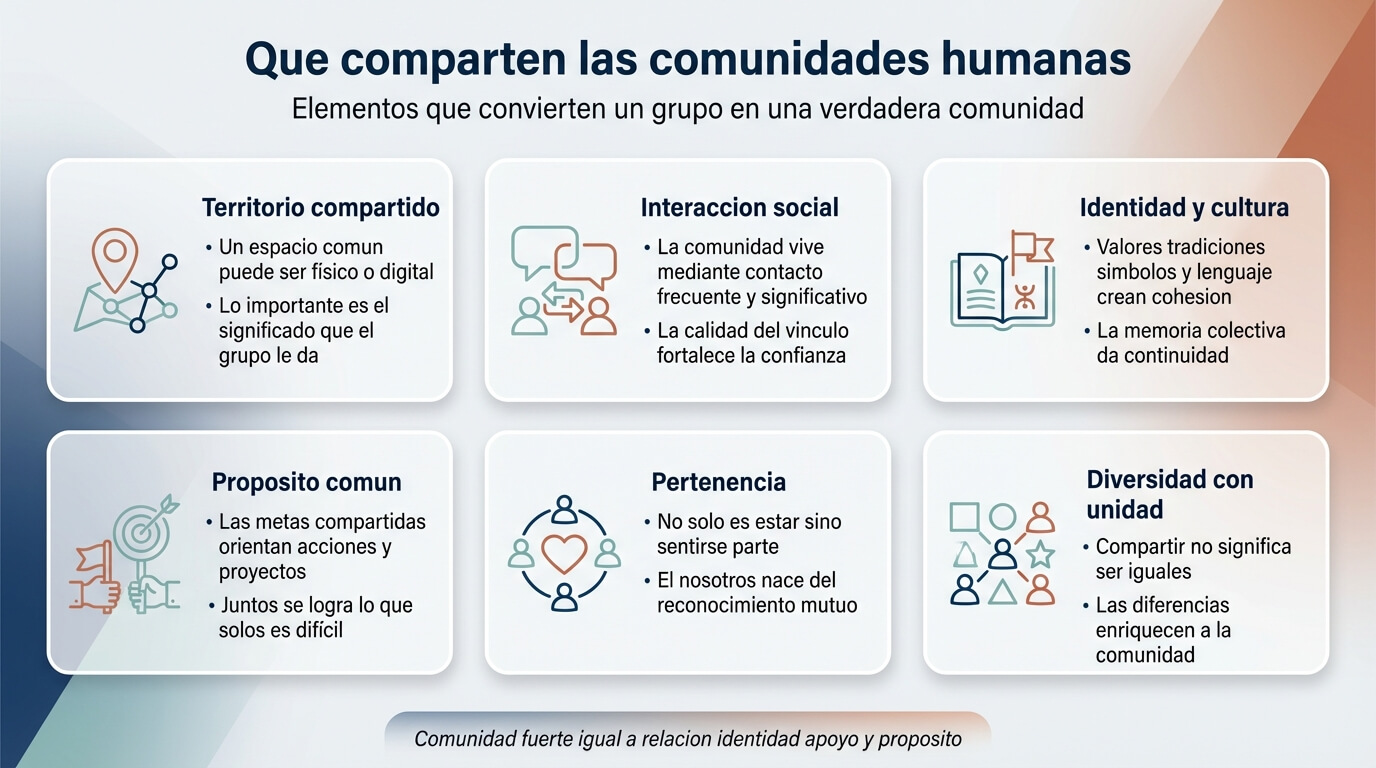 Al explorar qué comparten las comunidades humanas, hemos descubierto que lo que realmente une a las personas va mucho más allá de la proximidad física o las características superficiales. El territorio, la interacción, los valores, la cultura, los propósitos y el sentido de pertenencia forman un tejido complejo que transforma un grupo de individuos en algo más grande: una comunidad.
