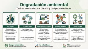 Te puede interesar: El impacto ambiental de los pañales desechables y cómo reducirloEs importante distinguir la degradación ambiental del impacto ambiental: el impacto es cualquier alteración del entorno (puede ser temporal o reversible), mientras que la degradación implica un daño sostenido que dificulta o impide la recuperación natural del ecosistema.