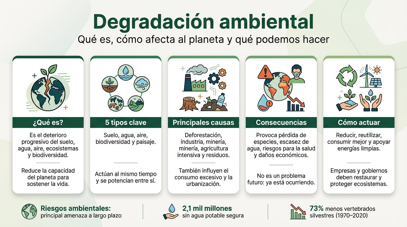 La degradación ambiental no es solo un término académico: es el proceso silencioso que erosiona los sistemas que hacen posible la vida en la Tierra. Sin embargo, la gran mayoría de artículos que la explican se limitan a una definición de manual, sin profundizar en sus tipos, sus consecuencias reales ni, sobre todo, en lo que cada persona puede hacer.